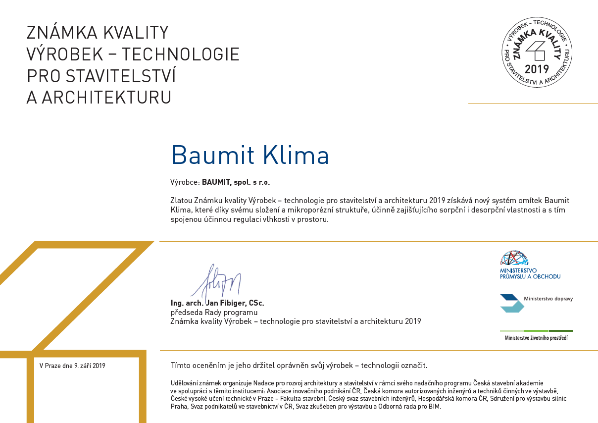 Máme velkou radost, že Známku kvality pro výrobek – technologii pro stavitelství a architekturu 2019 získal nový systém omítek Baumit Klima, který díky svému složení a mikroporézní struktuře, účinně zajišťuje sorpční i desorpční vlastnosti a s tím spojenou účinnou regulaci vlhkosti v prostoru.